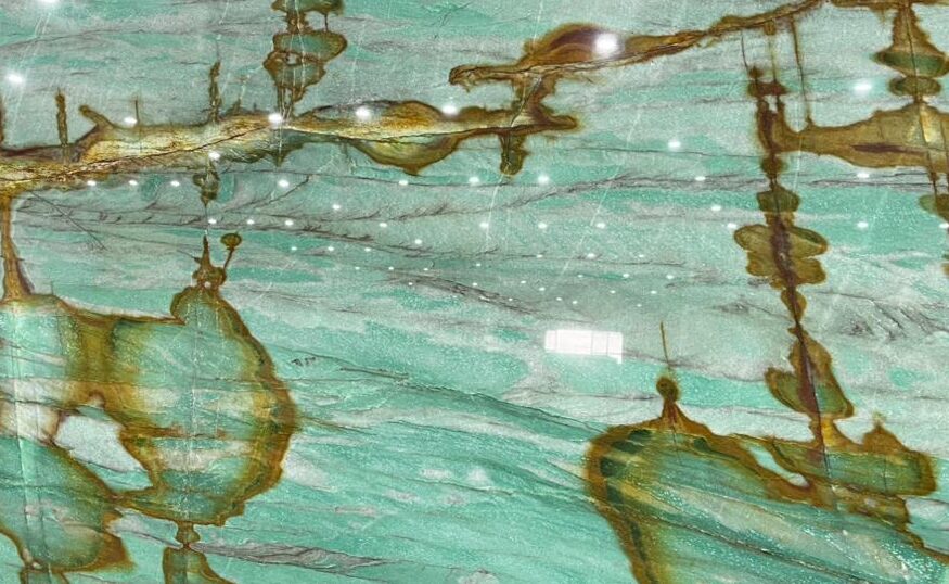 Behold the breathtaking beauty of Aurora Borealis Quartzite, a natural stone that captures the ethereal magic of the Northern Lights dancing across a midnight sky. Quarried from the finest Brazilian deposits, this ultra-premium quartzite is renowned for its mesmerizing blend of cool emerald greens, icy teals, deep sapphire blues, and dramatic veins of gold and violet that swirl across a translucent crystalline background – creating a luminous, almost three-dimensional effect that shifts and glows under different lighting.
